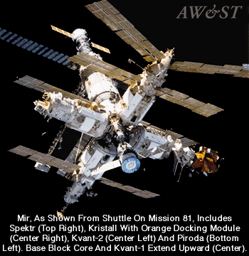 A real nice touch is having a shuttle dock to the Mir... the docking port in the shuttle bay not on Kristall (seen on image mir8.jpg and sts76-atlantis_from_mir.jpg and mir7.jpg ) in a shuttle would be about 20mm wide and come to top of shuttle "canopy" where the windows are. On the shuttle docking port I first fit (before gluing to the Mir model) the orange Kristall docking port and you will see the "orange" Kristall port (actually we put it there) in the Mir model is sort of conical and rounded on the end. I cut a matching snug indentation on the shuttle port (use left over parts from the ARSC) and applied a ton of the Duro resin epoxy. Mine hangs by that one point real nicely. If you want you can run a brass pipe from the Kristall thru to the docking port to make it extra sturdy, but my shuttle hangs and swings all day very nicely as is with no problem.