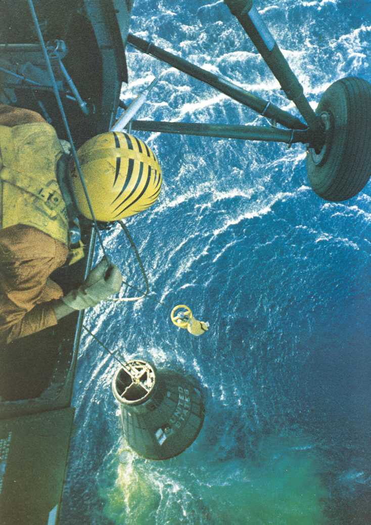 Pic #2: Attempted recovery of MR-4, before line was cut (NASA, from Baker, "The History of Manned Space Flight," p.131) |