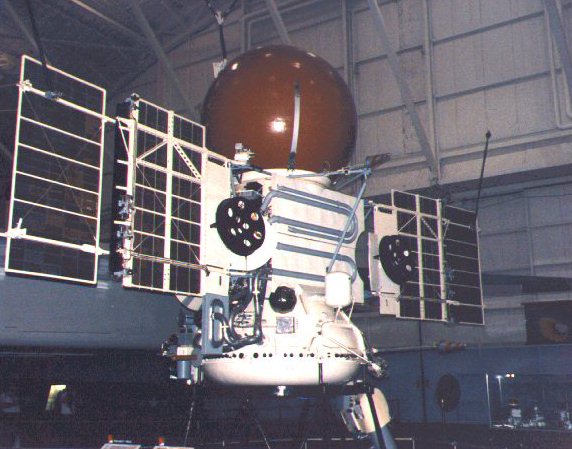 This is a full-scale engineering model of the Vega Venus-Halley probe. Two Vega probes were launched in December 1984. Each spacecraft dropped a lander (carried in the large brown ball at the top of the spacecraft) onto the Venusian surface in June 1985. Each lander deployed a balloon into the Venusian atmosphere which provided the first long term direct measurements of the atmosphere. The main spacecraft continued on to flyby passes of Halley's Comet in March 1986. These probes provided the first closeup images of the comet and provided the information necessary to successfully send the European Giotto probe into the coma.